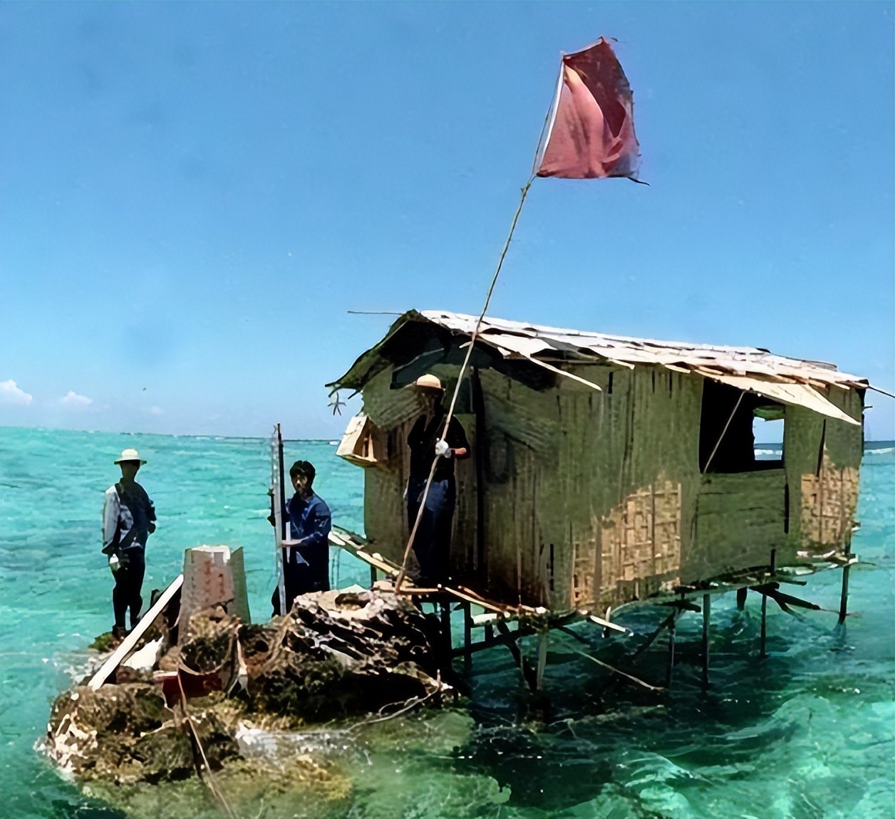 在90年代初期,驻守在南薰礁上的十多位官兵,他们的居住条件十分艰苦。平常他们活动的高脚屋,就是用几根木头做成地基,然后在上面铺设几张篾席,几块油布。