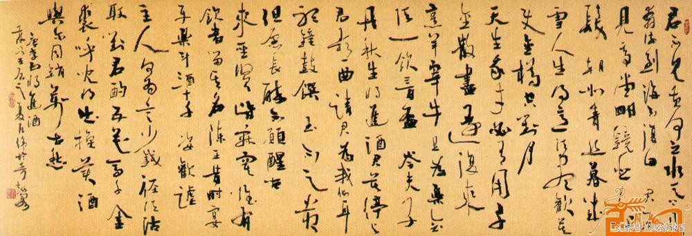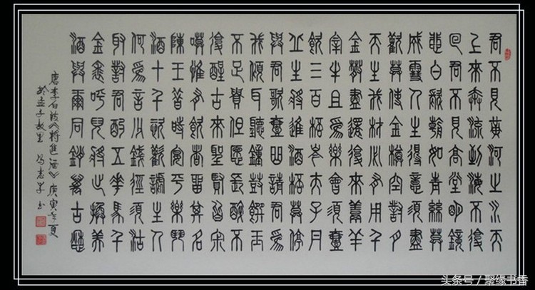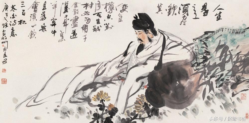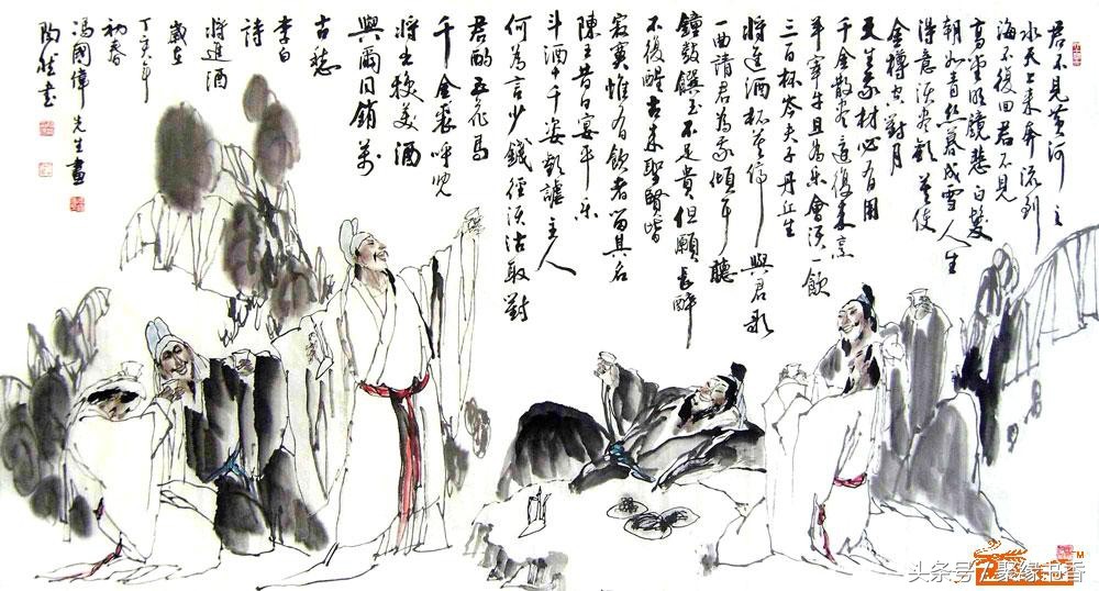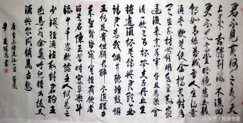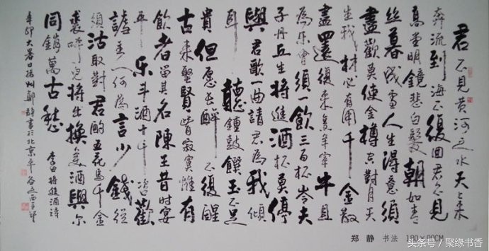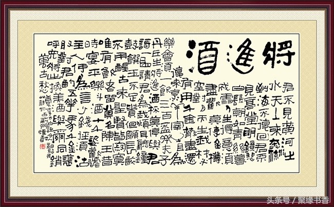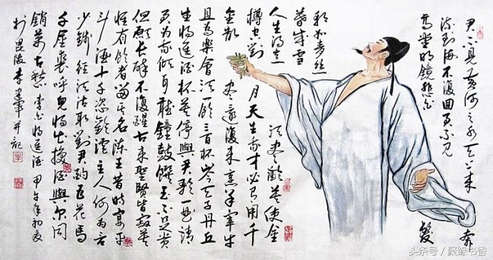 【聚缘书香云】《将进酒》篇幅不算长,却五音繁会,气象不凡。它笔酣墨饱,情极悲愤而作狂放,语极豪纵而又沉着。诗篇具有震动古今的气势与力量,这诚然与夸张手法不无关系,比如诗中屡用巨额数目字(“千金”、“三百杯”、“斗酒十千”、“千金裘”、“万古愁”等等)表现豪迈诗情,同时,又不给人空洞浮夸感,其根源就在于它那充实深厚的内在感情,那潜在酒话底下如波涛汹涌的郁怒情绪。此外,全篇大起大落,诗情忽翕忽张,由悲转乐、转狂放、转愤激、再转狂放、最后结穴于“万古愁”,回应篇首,如大河奔流,有气势,亦有曲折,纵横捭阖,力能扛鼎。其歌中有歌的包孕写法,又有鬼斧神工、“绝去笔墨畦径”之妙,既不是刻意刻画和雕凿能学到的,也不是草率就可达到的境界。通篇以七言为主,而以三、五十言句“破”之,极参差错综之致;诗句以散行为主,又以短小的对仗语点染(如“岑夫子,丹丘生”“五花马,千金裘”),节奏疾徐尽变,奔放而不流易。