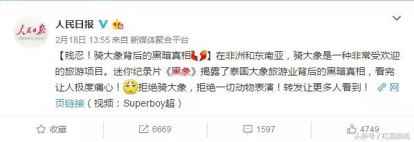 8月初,人民日报官方微博发布消息——国内三家旅行社停售“骑大象”旅游产品,并配《黑象》视频,对于这种官方的认可,超导激动难抑,随即转发并写了这样一段话: