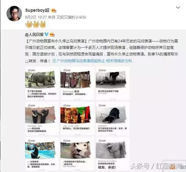 9月2日,有24年马戏表演历史的广州动物园宣布永久停止马戏表演。超导随即转发该消息,比了三个爱的手势。